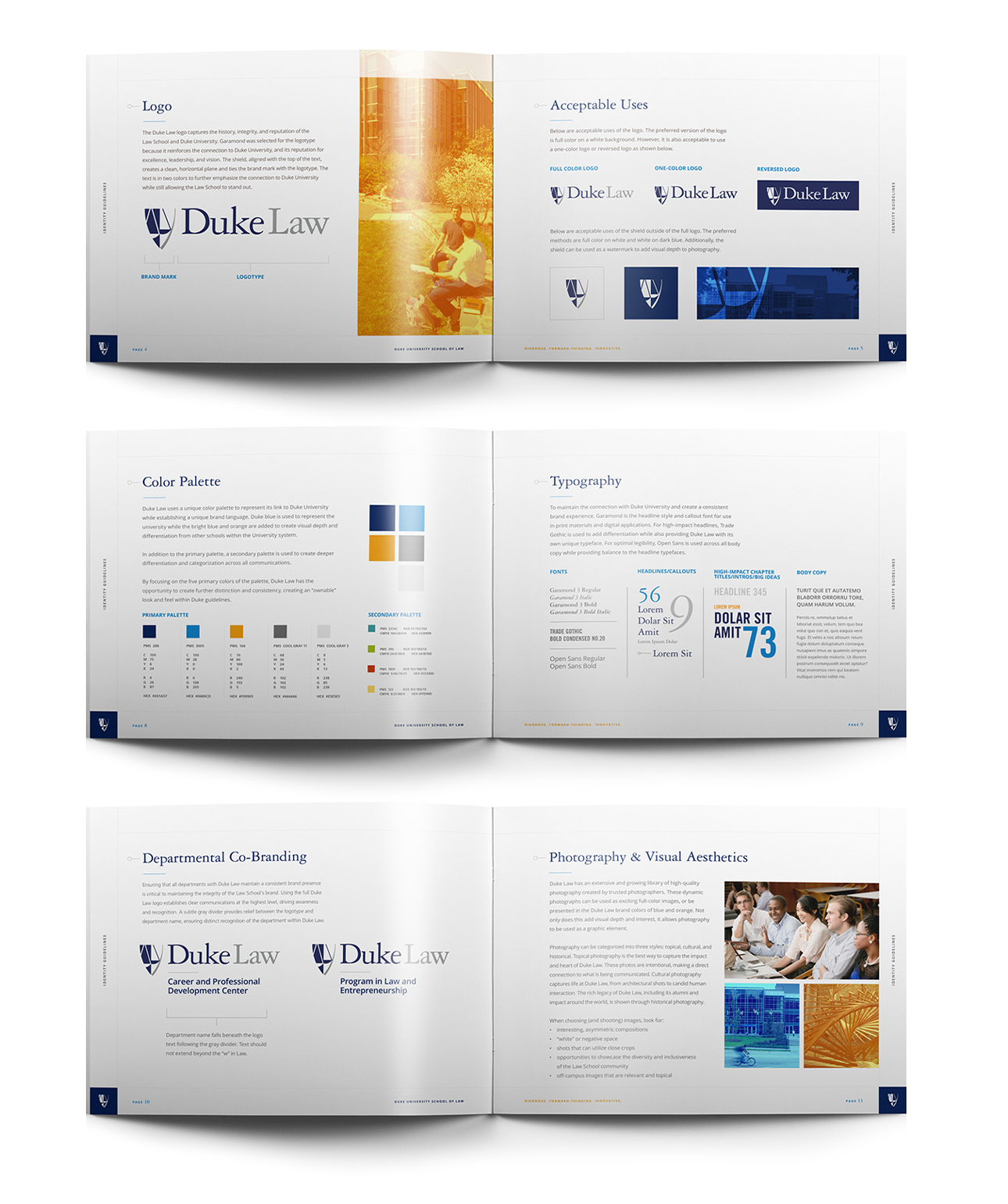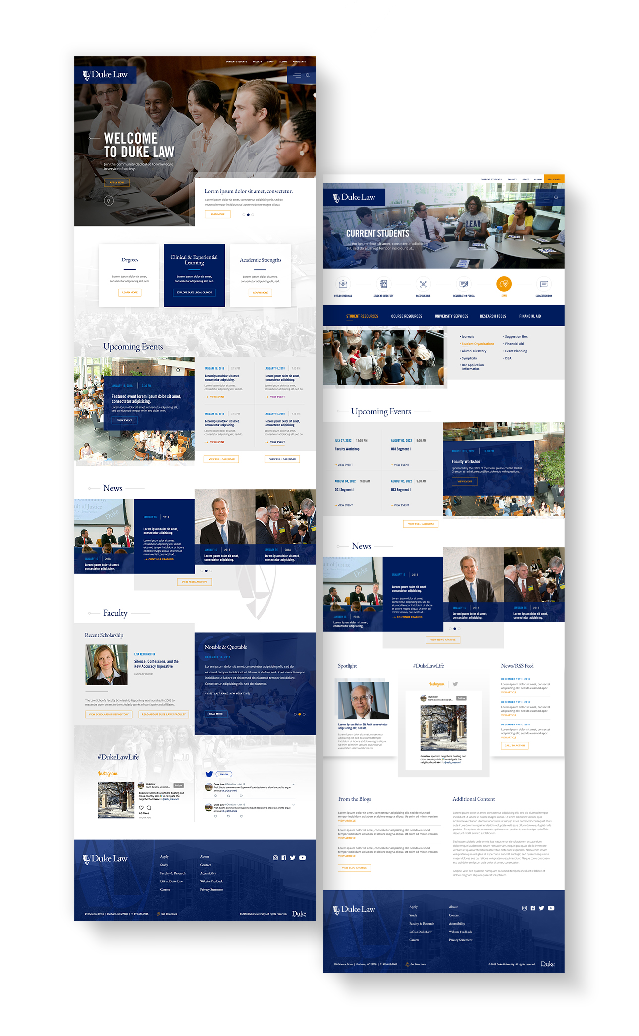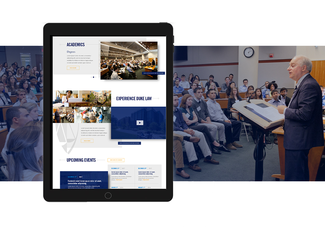 Duke Law School engaged with us to update their brand and tie it back to the rich history, vision, and place among the larger Duke ecosystem. Over the years, many internal departments began using a variety of one-off logos to represent groups, organizations, and the school as a whole. This resulted in an identity crisis with a lack of consistency that was slowly deteriorating the brand. After conducting on site research and interviews, we provided several branding recommendations, beginning with the logo and all possible use-cases associated with it. The finished brand guide helped key stakeholders execute all communications on brand while providing an extended visual language to differentiate within the school. Once the branding was in place, we crafted a new framework and UX strategy for the website that included 7,500+ pages with live integrated data sources. Additional microsite’s provided professors with the ability to create and manage their own “Centers” complete with landing and content pages, as well as their own blog platforms all within the Drupal environment.