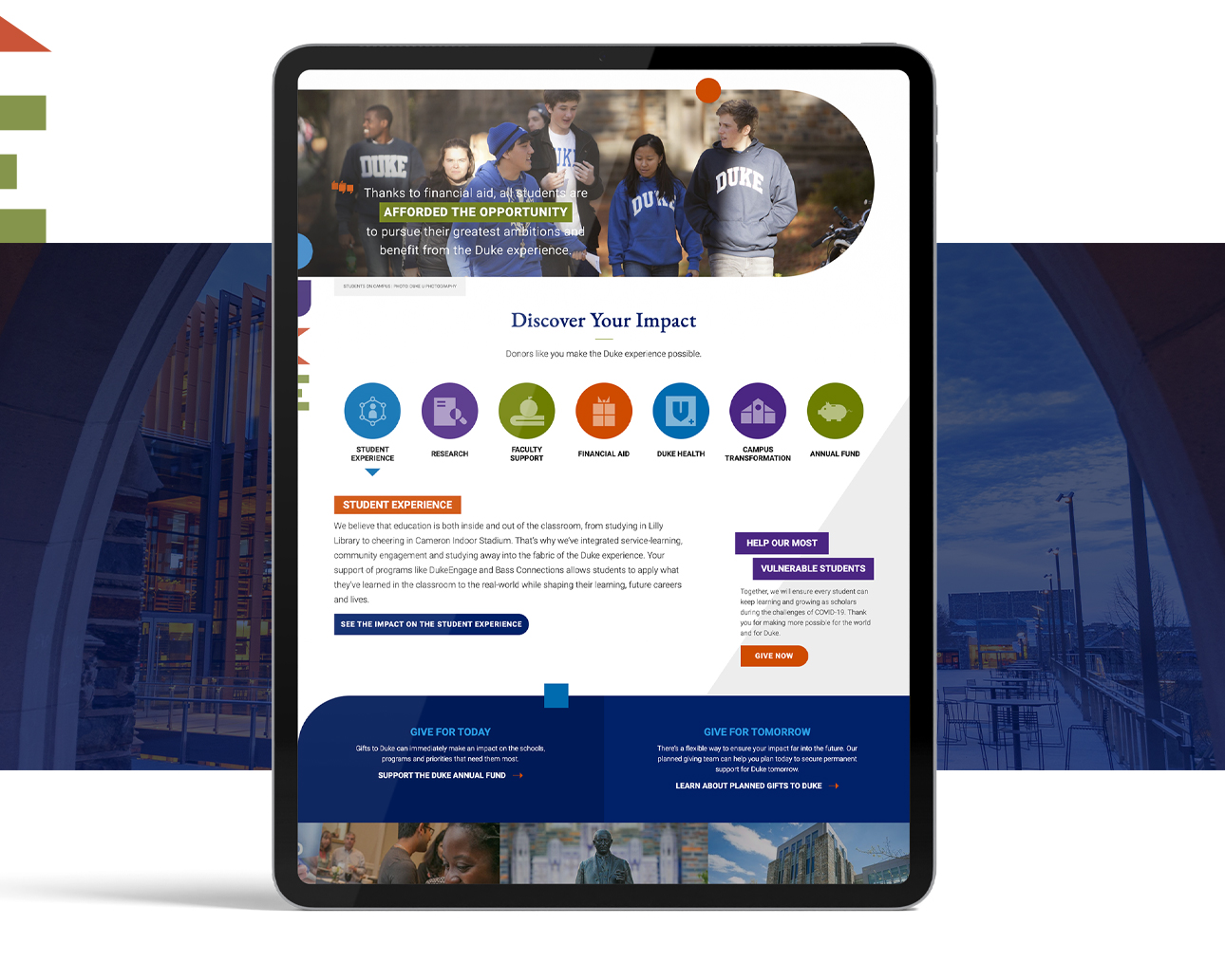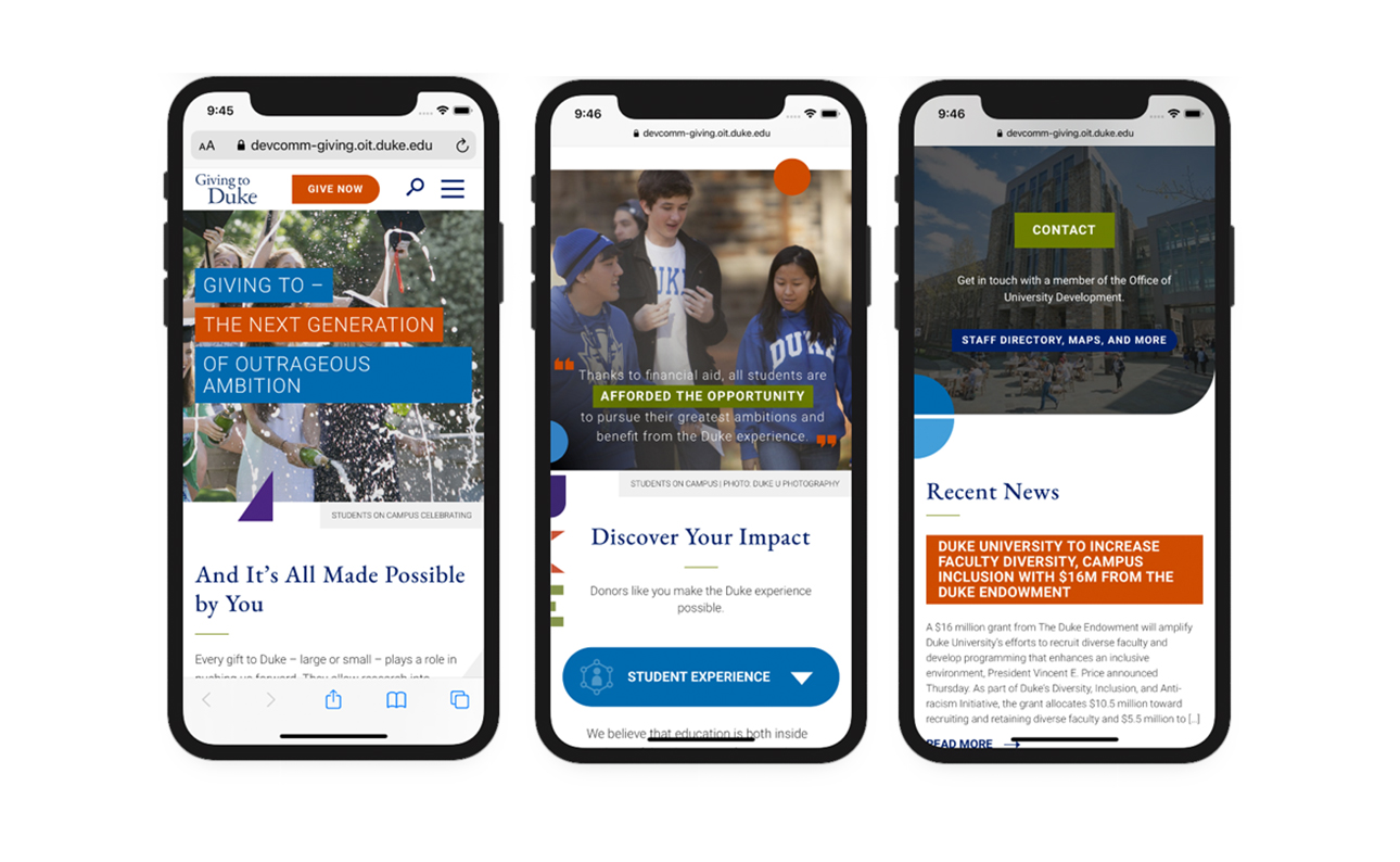 Duke’s Alumni Engagement and Development communications team were looking for a more compelling web presence that better told the story of philanthropy at Duke. Our team created a more succinct and compelling online experience to resolve the challenges at hand. Working with Duke’s Alumni Engagement and Development communications team, we rethought the information architecture to inform a new, welcoming, visually rich central gateway for all alumni and visitors. The result was a website that better showcased the impact of gifts at Duke, while providing alumni and donors easier access to a vast array of stories and related information that more fully illustrate their direct impact.