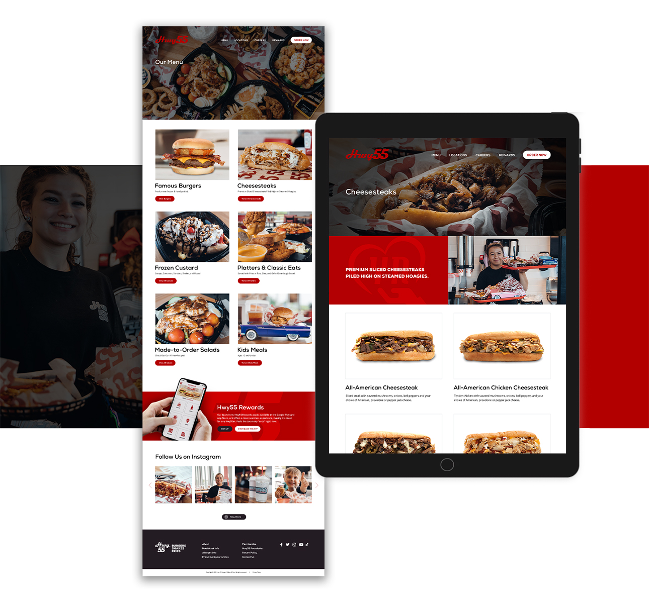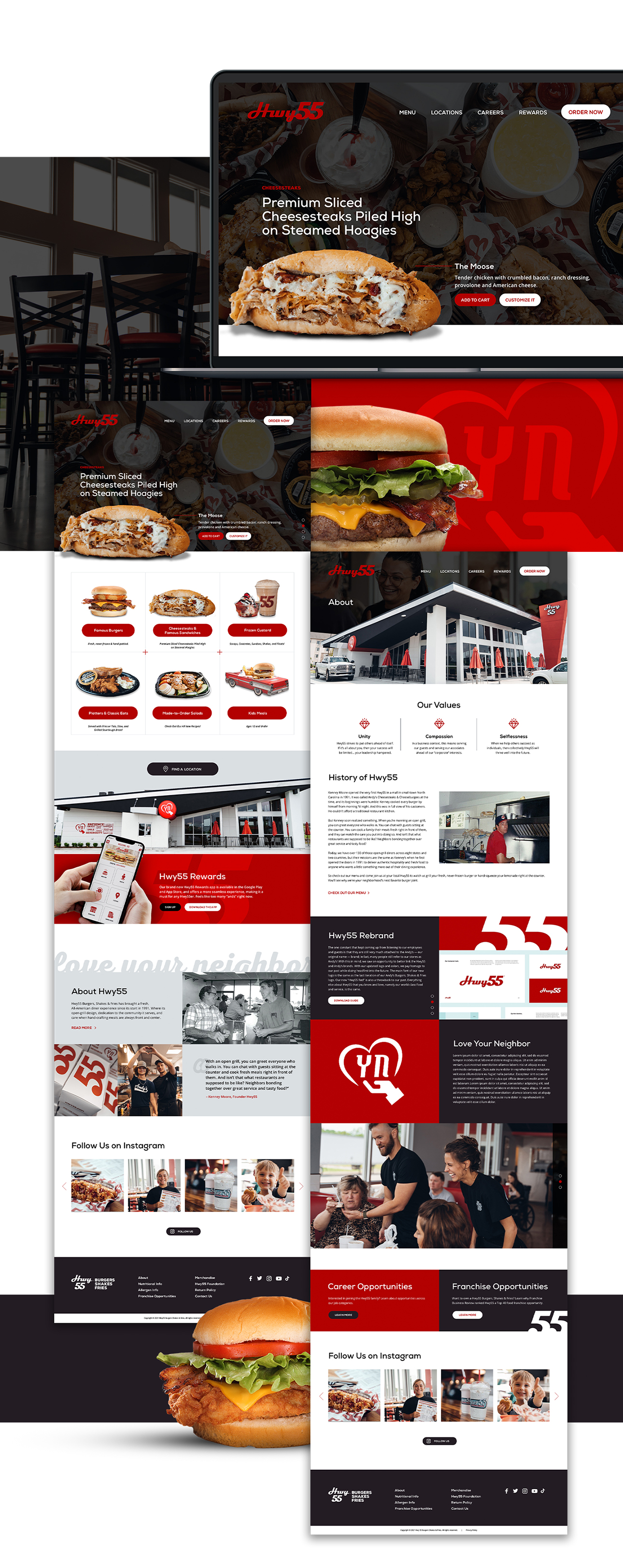 Tasked with creating a website to reflect the new look and feel of the brand, we designed and developed a new online experience for Hwy55 that seamlessly integrated with OLO, the interface between restaurants and the on-demand world. All of this was done while keeping the two things Hwy55 cares about most, good food and a “love your neighbor” attitude, at the forefront.