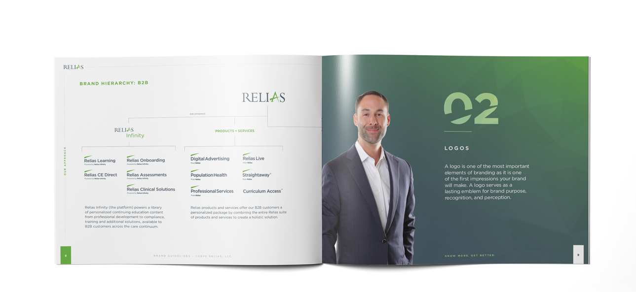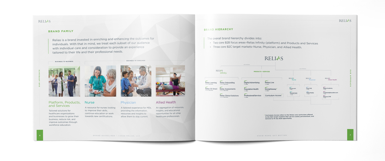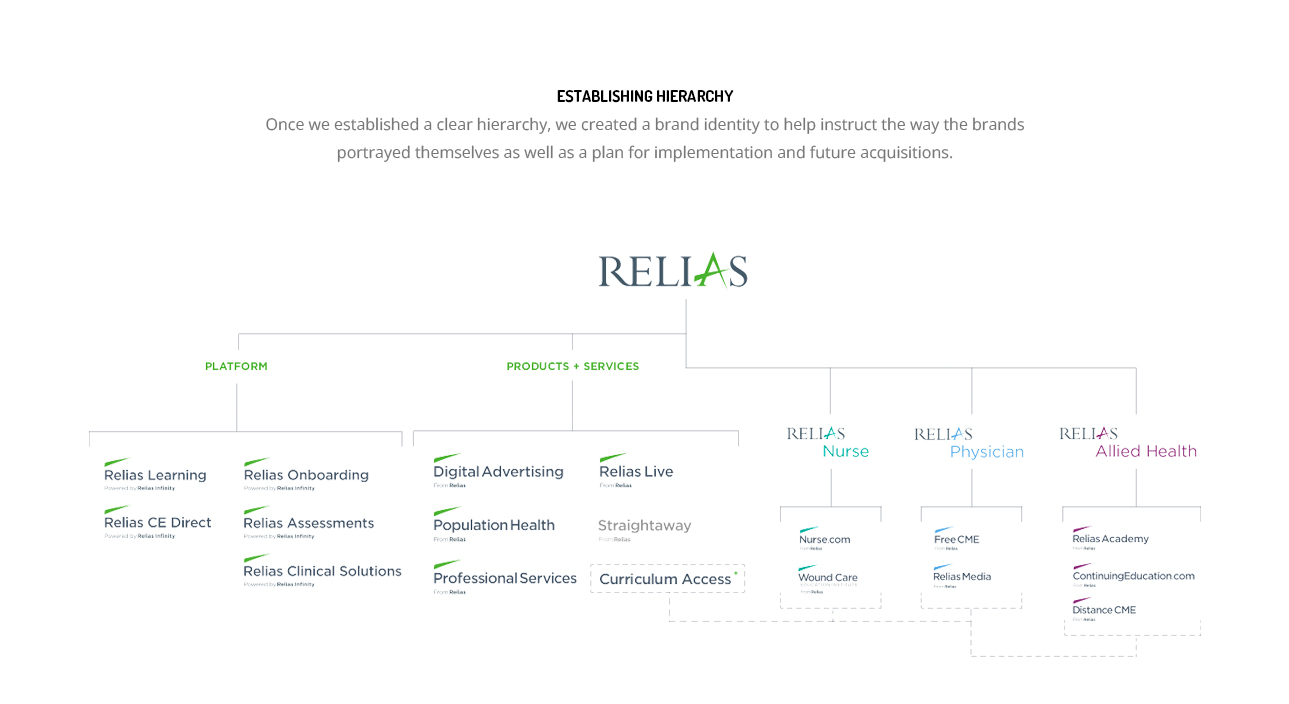 Relias, a leader in healthcare LMS software, got to a point where business acquisitions had outpaced their brand, such that their family of brands lacked a cohesive strategy, overarching brand structure, hierarchy, and visual language. Our team was tasked with clearly defining the Relias brand and all its subordinate brands, not only creating a brand map to accommodate the current family of brands, but to design a system under which new brands could easily be incorporated in the future.